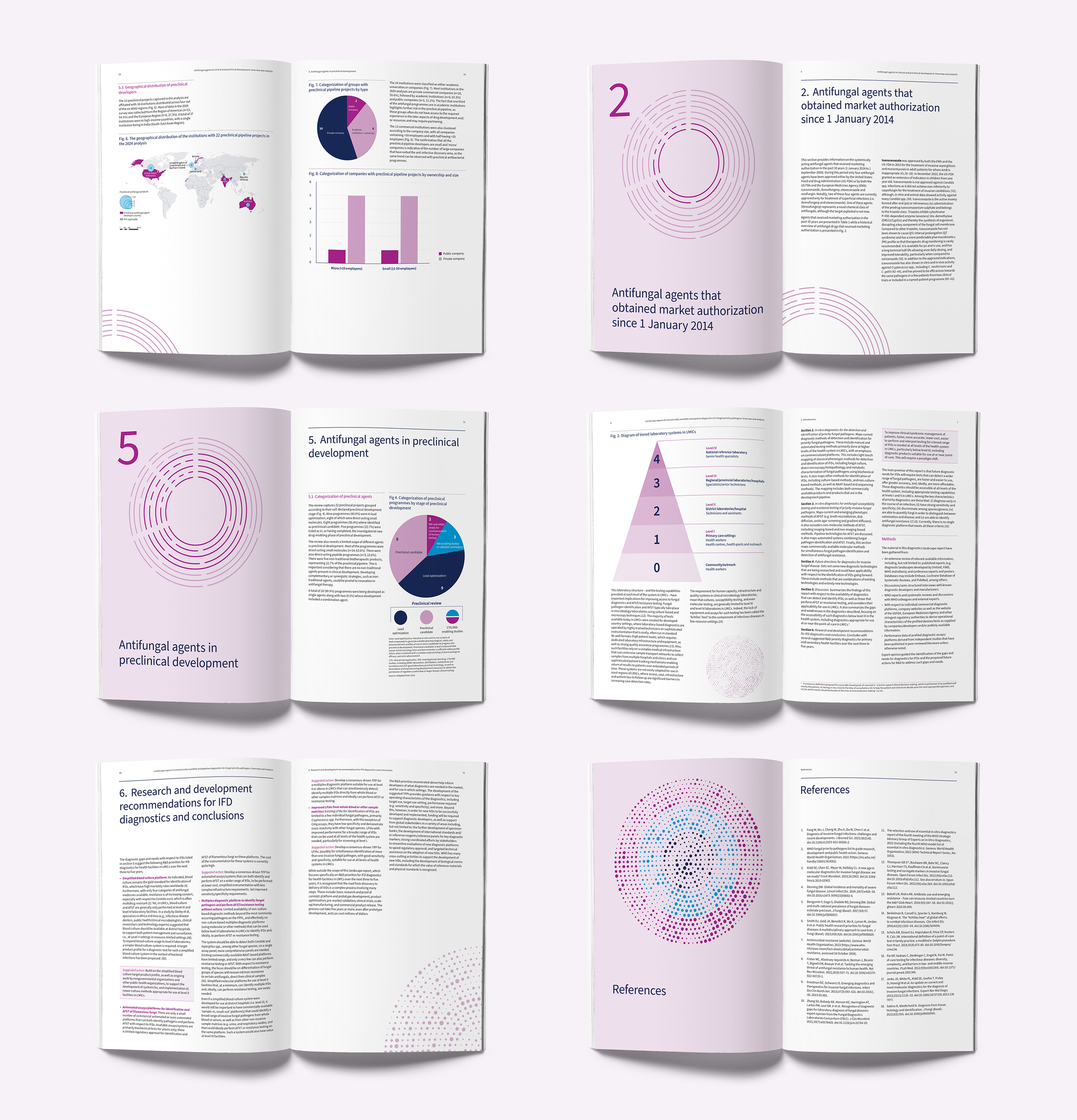 The Antimicrobial Resistance Division at the World Health Organization releases regular reports highlighting updates in fungal and bacterial diseases. Using provided visual references and following WHO’s established brand guidelines, graphic devices were developed to differentiate the topics of diagnostics and treatment development, which were relevant to both pathogen types.